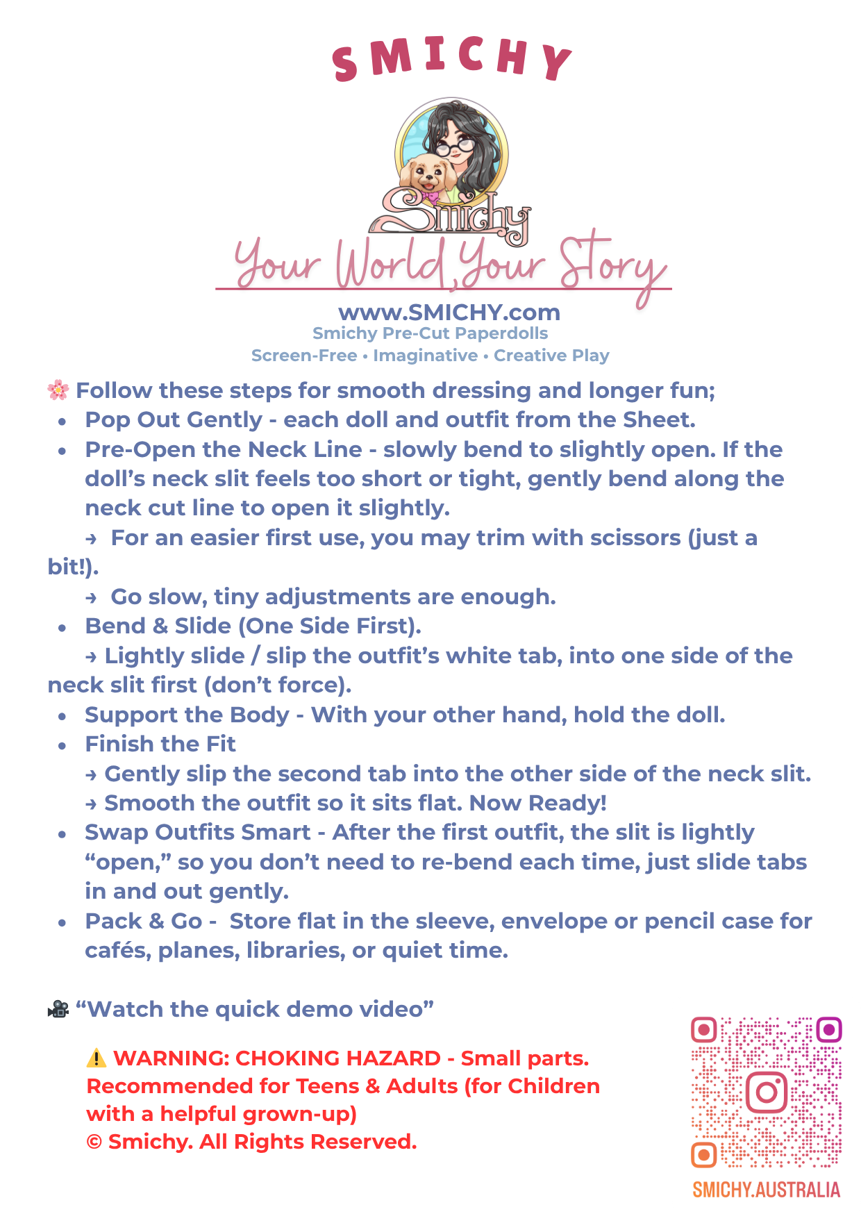 • Care Tips for Longer Fun - Avoid bending back and forth. Handle gently like a craft collectible, not a toy. Store flat in the sleeve or pouch to keep outfits crisp.